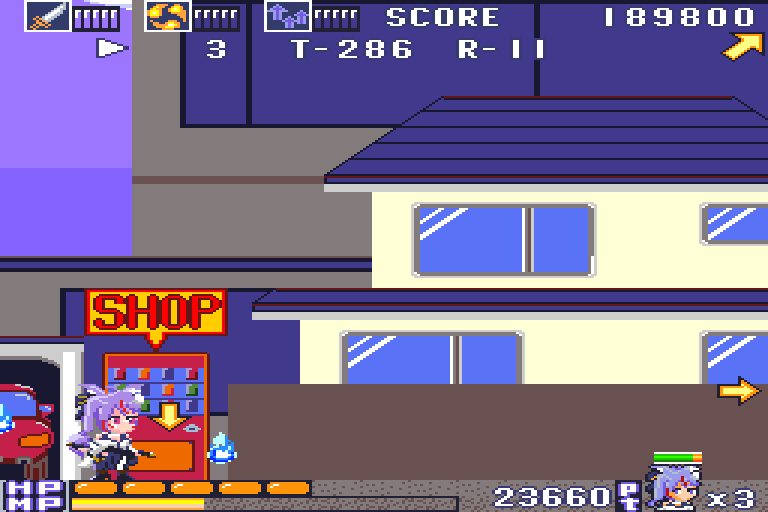 方向キーを下に入れながら、攻撃ボタンを押すとショップに入ることが出来ます。